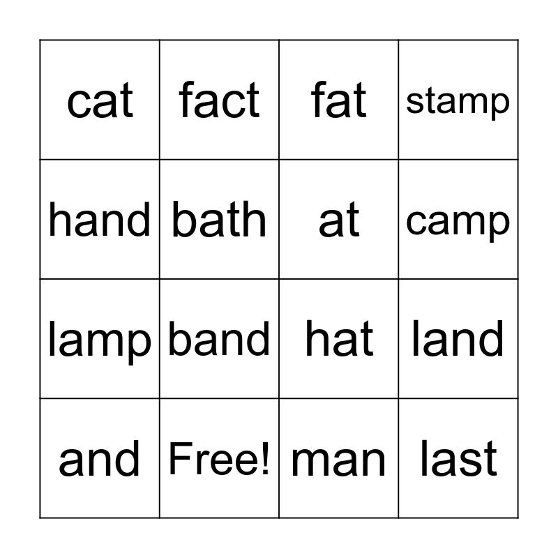 This bingo card has 21 words: Free!, act, fact, can, man, at, cat, fat, hat, camp, lamp, stamp, last, fast, bath, half, and, band, hand, land and sand.