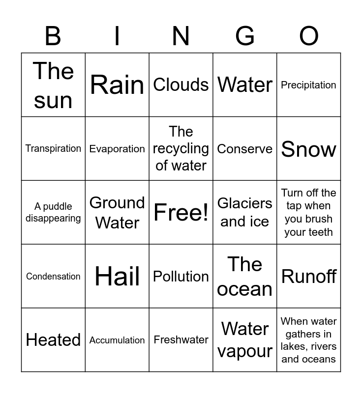 This bingo card has a free space and 24 words: Hail, Accumulation, The recycling of water, Heated, Precipitation, The sun, Transpiration, Rain, Glaciers and ice, Pollution, Conserve, A puddle disappearing, The ocean, Runoff, Evaporation, Water vapour, Turn off the tap when you brush your teeth, Clouds, Snow, Ground Water, When water gathers in lakes, rivers and oceans, Condensation, Water and Freshwater.