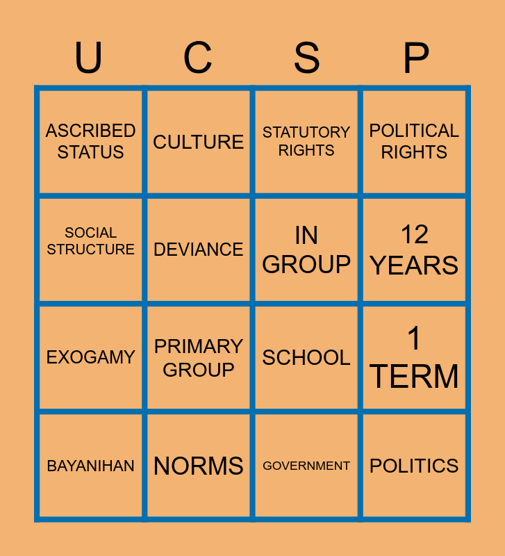 This bingo card has 16 words: BAYANIHAN, NORMS, STATUTORY RIGHTS, POLITICAL RIGHTS, SOCIAL STRUCTURE, CULTURE, SCHOOL, 1 TERM, ASCRIBED STATUS, DEVIANCE, GOVERNMENT, 12 YEARS, EXOGAMY, PRIMARY GROUP, IN GROUP and POLITICS.