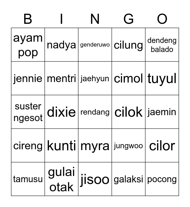 This bingo card has a free space and 24 words: kunti, gulai otak, jaehyun, tamusu, dendeng balado, ayam pop, jennie, nadya, cilok, myra, cimol, suster ngesot, jungwoo, cilor, mentri, galaksi, jaemin, genderuwo, tuyul, dixie, pocong, cireng, cilung and jisoo.