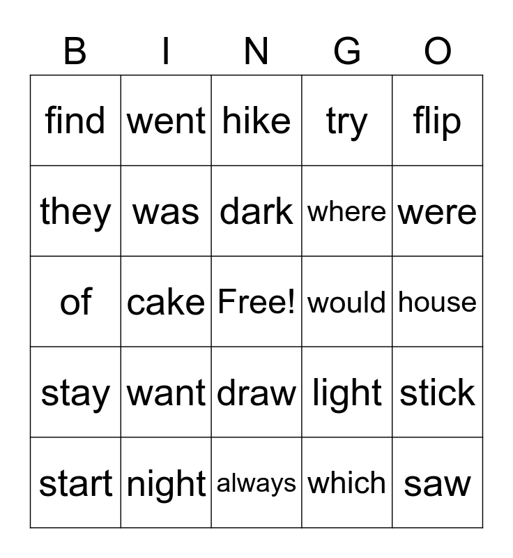 This bingo card has a free space and 24 words: want, night, dark, start, flip, find, they, went, would, draw, where, of, light, stick, was, which, house, hike, were, cake, saw, stay, try and always.