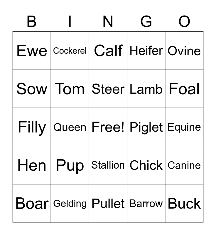 This bingo card has a free space and 24 words: Pup, Gelding, Steer, Boar, Ovine, Ewe, Sow, Cockerel, Piglet, Stallion, Lamb, Filly, Chick, Canine, Tom, Barrow, Equine, Calf, Foal, Queen, Buck, Hen, Heifer and Pullet.