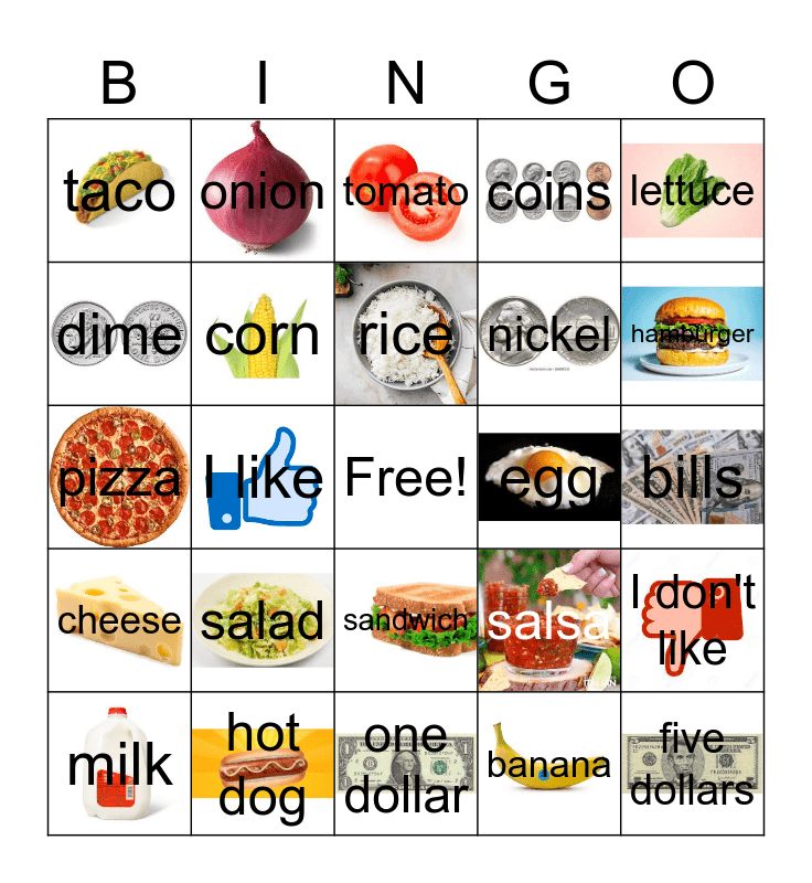 This bingo card has 34 images, a free space and 34 words: apple, banana, beans, bread, cheese, corn, lettuce, milk, onion, orange, rice, tomato, chicken, chips, egg, hamburger, hot dog, pizza, salad, salsa, sandwich, soup, taco, bills, one dollar, five dollars, coins, penny, nickel, dime, quarter, I like, I don't like and How much?.