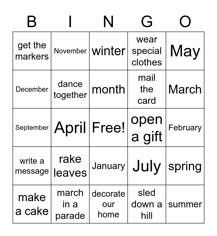 This bingo card has a free space and 42 words: fall, month, plant seeds, rake leaves, sled down a hill, spring, summer, swim in a lake, winter, January, February, March, April, May, June, July, August, September, October, November, December, cut the paper, fold the paper, get the markers, glue on a picture, greeting card, mail the card, measure the paper, put the card inside, ruler, write the address, write a message, dance together, decorate our home, light candles, make a cake, march in a parade, open a gift, send a card, share a meal, wear special clothes and wrap a present.
