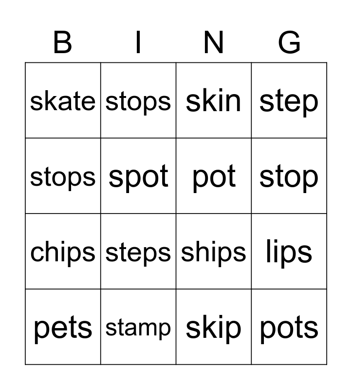This bingo card has 16 words: stamp, lips, skin, skate, chips, stops, ships, skip, stops, spot, pets, step, steps, stop, pot and pots.