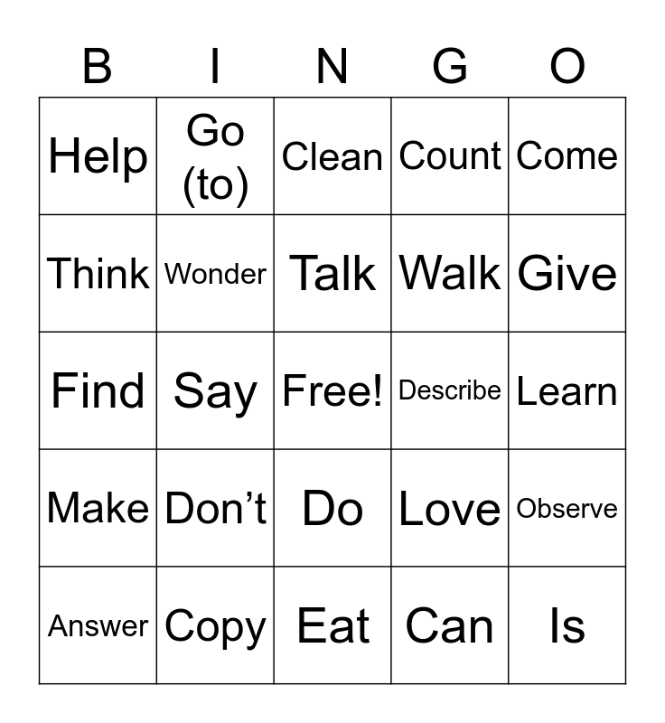 This bingo card has a free space and 45 words: Am, Is, Are, Answer, Ask, Can, Clean, Color, Come, Copy, Count, Describe, Do, Don’t, Draw, Eat, Feel, Find, Get, Give, Go (to), Greet, Have, Help, Know, Learn, Like, Line-up, Love, Make, Need, Observe, Play, Put (on), Read, Say, See, Show, Take, Talk, Think, Walk, Want, Wonder and Write.