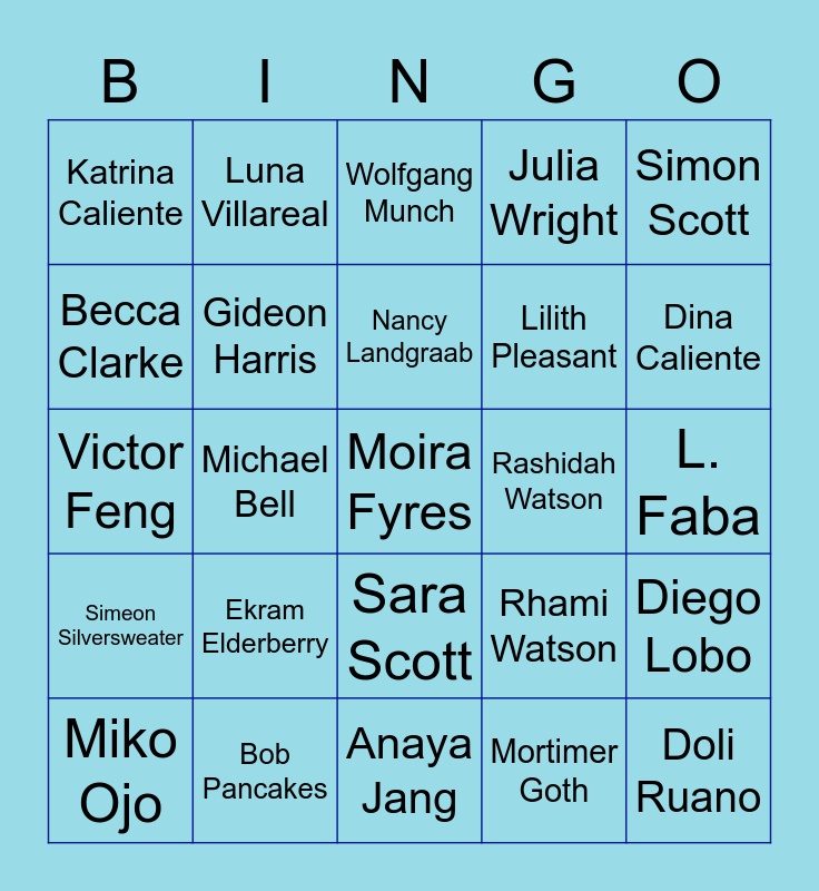 This bingo card has 95 words: Free!, Bella Goth, Mortimer Goth, Vivian Lewis, Eric Lewis, Alice Spencer-Kim, Olivia Spencer-Kim-Lewis, Bob Pancakes, Eliza Pancakes, Liberty Lee, Travis Scott, Summer Holiday, Geoggrey Landgraab, Nancy Landgraab, Johnny Zest, Katrina Caliente, Dina Caliente, Don Lothario, Zoe Patel, Supriya Delgato, Justin Delgato, Catarina Lynx, Brent Hecking, Brant Hecking, Julia Wright, Becca Clarke, Angela Pleasant, Lilith Pleasant, Eleanore Elderberry, Cameron Fletcher, Ekram Elderberry, Geeta Rasoya, Raj Rasoya, Penny Pizzazz, Miko Ojo, Darling Walsh, Anaya Jang, Billie Jang, Victor Feng, Lily Feng, Diego Lobo, Michael Bell, Sara Scott, Simon Scott, Rhami Watson, Rashidah Watson, Imran Watson, Celeste Michaelson, Christopher Michaelson, Idnacio Robles, Bernice Robles, Aurelio Robles, Doli Ruano, Tala Ruano, Xochitl Luna, Eleanor Sullivan, Cletus Harris, Francine Harris, Jeb Harris, Faye Harris, Gideon Harris, Blossom Greenburg, Knox Greenburg, Bess Sterling, Tina Tinker, Yasemin Tinker, Olivia Tinker, Lucas Munch, Wolfgang Munch, Ulrike Faust, Maaike Haas, Dominic Fyres, Moira Fyres, Candy Behr, Yuki Behr, Eva Capricciosa, Jade Rose, Joaquin Le Chien, Sergio Romeo, Bjorn Bjerson, Luna Villareal, Clara Bjergson, Lily Shu, Jacob Volkov, Kristopher Volkov, L. Faba, Simeon Silversweater, Morgyn Ember, Grace Anasni, Emilia Ernest, Gemma Charm, Caleb Vatore, Lilith Vatore, Vladislaus Straud, Ian Moody and Derek McMillan..