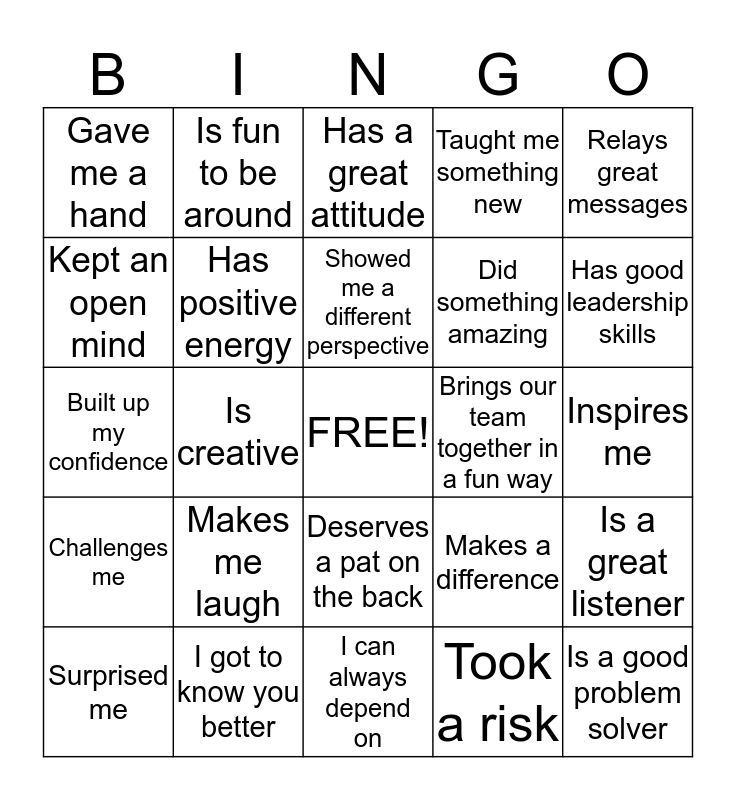 This bingo card has a free space and 24 words: Makes me laugh, I got to know you better, Showed me a different perspective, Surprised me, Relays great messages, Gave me a hand, Kept an open mind, Is fun to be around, Brings our team together in a fun way, Deserves a pat on the back, Did something amazing, Built up my confidence, Makes a difference, Is a great listener, Has positive energy, Took a risk, Inspires me, Has a great attitude, Has good leadership skills, Is creative, Is a good problem solver, Challenges me, Taught me something new and I can always depend on.