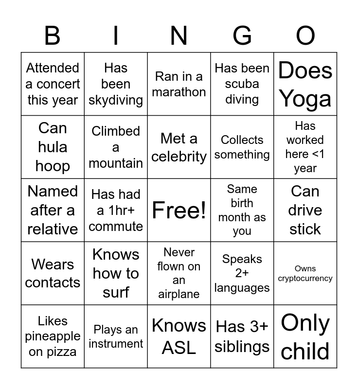 This bingo card has a free space and 25 words: Knows how to surf, Knows ASL, Met a celebrity, Likes pineapple on pizza, Does Yoga, Attended a concert this year, Can hula hoop, Has been skydiving, Same birth month as you, Never flown on an airplane, Collects something, Named after a relative, Speaks 2+ languages, Owns cryptocurrency, Climbed a mountain, Moved in the past year, Can drive stick, Ran in a marathon, Has worked here <1 year, Has had a 1hr+ commute, Only child, Plays an instrument, Wears contacts, Has been scuba diving and Has 3+ siblings.