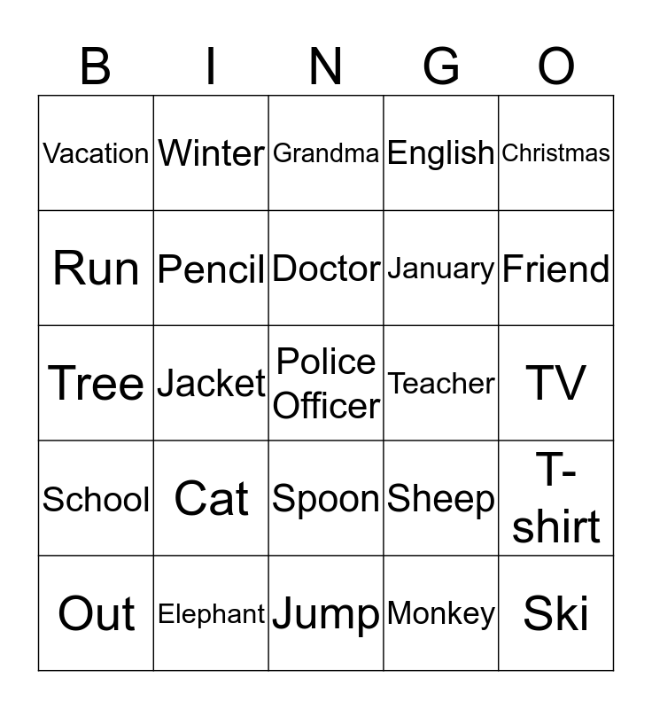 This bingo card has 25 words: Cat, Jump, Doctor, Out, Christmas, Vacation, Run, Winter, Teacher, Spoon, January, Tree, Sheep, T-shirt, Pencil, Ski, TV, Grandma, Friend, Jacket, Police Officer, Elephant, School, English and Monkey.