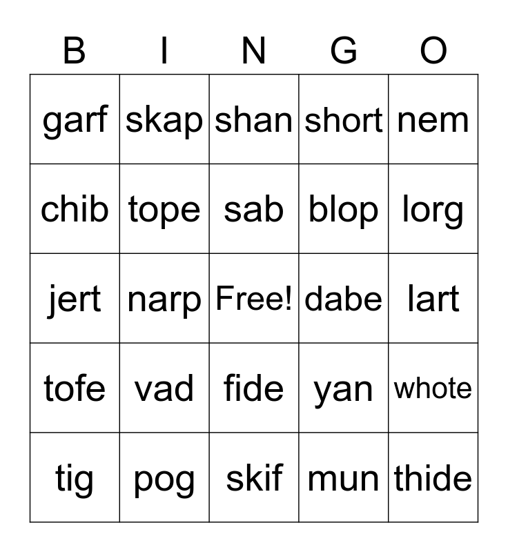 This bingo card has a free space and 24 words: vad, pog, sab, tig, nem, garf, chib, skap, dabe, fide, blop, jert, yan, whote, tope, mun, lart, shan, lorg, narp, thide, tofe, short and skif.