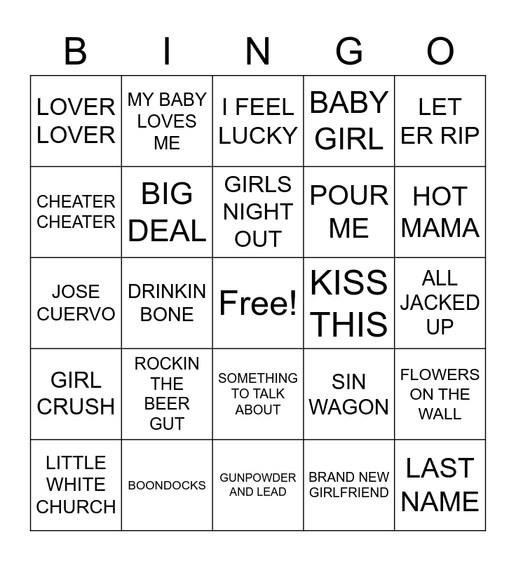 This bingo card has a free space and 54 words: TENNESSEE WHISKEY, GIRL CRUSH, MY CHURCH, STAY, SOMETHING TO TALK ABOUT, FANCY, BABY GIRL, LEAVE THE PIECES, CHEATER CHEATER, STUCK LIKE GLUE, LOVER LOVER, REDNECK WOMAN, BOONDOCKS, LITTLE WHITE CHURCH, ANY MAN OF MINE, GUNPOWDER AND LEAD, LAST NAME, POUR ME, WHOSE BED HAVE YOUR BOOTS BEEN UNDER, ALL JACKED UP, SIN WAGON, HOMEWRECKER, KISS THIS, LET ER RIP, HOW DO YOU LIKE ME NOW, MY BABY LOVES ME, I WANNA TALK ABOUT ME, WHY HAVEN'T I HEAD FROM YOU, HERE FOR THE PARTY, BRAND NEW GIRLFRIEND, WATERMELON CRAWL, MEET IN THE MIDDLE, BE MY BABY TONIGHT, HARPER VALLEY PTA, I FEEL LUCKY, UNBELIEVABLE, JOSE CUERVO, FLOWERS ON THE WALL, BOP, BIG DEAL, ITS A GREAT DAY TO BE ALIVE, FRIENDS IN LOW PLACES, SWINGIN, THE RACE IS ON, ROCKIN THE BEER GUT, NOBODY, PAPA LOVED MAMA, HAVE MERCY, GIRLS NIGHT OUT, DRINKIN BONE, HOT MAMA, MOUNTAIN MUSIC, THEN WHAT? and WINE BEER WHISKEY.