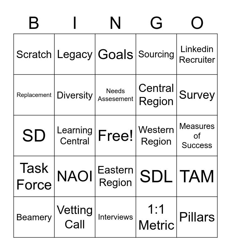 This bingo card has a free space and 24 words: NAOI, Vetting Call, Needs Assesement, Beamery, Linkedin Recruiter, Scratch, Replacement, Legacy, Western Region, Eastern Region, Central Region, SD, SDL, TAM, Diversity, 1:1 Metric, Measures of Success, Goals, Survey, Learning Central, Pillars, Task Force, Sourcing and Interviews.