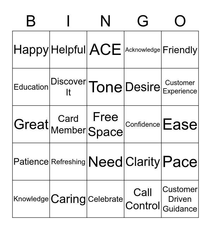 This bingo card has a free space and 24 words: Refreshing, Caring, Tone, Knowledge, Friendly, Happy, Education, Helpful, Confidence, Need, Desire, Great, Clarity, Pace, Discover It, Call Control, Ease, ACE, Customer Experience, Card Member, Customer Driven Guidance, Patience, Acknowledge and Celebrate.