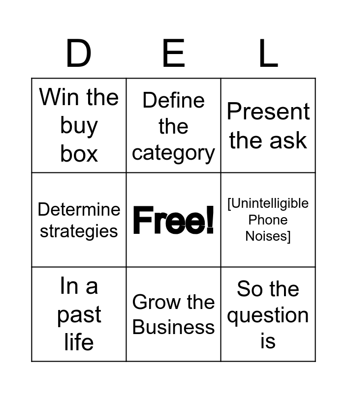 This bingo card has a free space and 8 words: [Unintelligible Phone Noises], Present the ask, Define the category, In a past life, Win the buy box, So the question is, Determine strategies and Grow the Business.