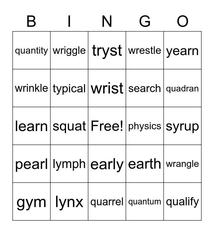 This bingo card has a free space and 29 words: gym, squad, squat, quality, quantity, tryst, typical, lymph, physics, lynx, syrup, qualify, quarrel, quantum, quadran, quarry, early, pearl, yearn, learn, earth, heard, search, wrinkle, wrestle, wriggle, wrangle, wrist and earl.