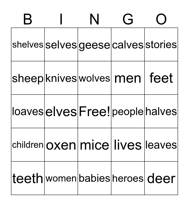 This bingo card has a free space and 24 words: oxen, women, wolves, teeth, stories, shelves, sheep, selves, people, mice, men, loaves, lives, leaves, knives, heroes, halves, geese, feet, elves, deer, children, calves and babies.