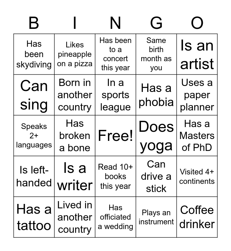 This bingo card has a free space and 24 words: Is a writer, Lived in another country, In a sports league, Has a tattoo, Is an artist, Has been skydiving, Can sing, Likes pineapple on a pizza, Does yoga, Read 10+ books this year, Has a phobia, Speaks 2+ languages, Can drive a stick, Visited 4+ continents, Born in another country, Plays an instrument, Has a Masters of PhD, Has been to a concert this year, Uses a paper planner, Has broken a bone, Coffee drinker, Is left-handed, Same birth month as you and Has officiated a wedding.