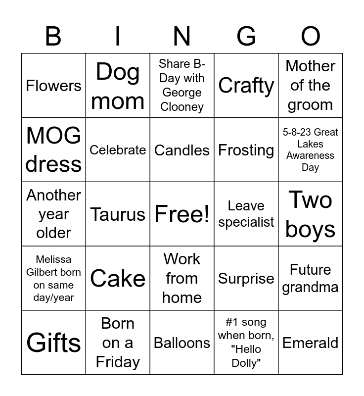 This bingo card has a free space and 25 words: Cake, Balloons, Candles, Gifts, Mother of the groom, Flowers, MOG dress, Dog mom, Leave specialist, Work from home, Frosting, Another year older, Surprise, Future grandma, Celebrate, 1964, Two boys, Share B-Day with George Clooney, 5-8-23 Great Lakes Awareness Day, Taurus, Emerald, Born on a Friday, Melissa Gilbert born on same day/year, Crafty and #1 song when born, "Hello Dolly".