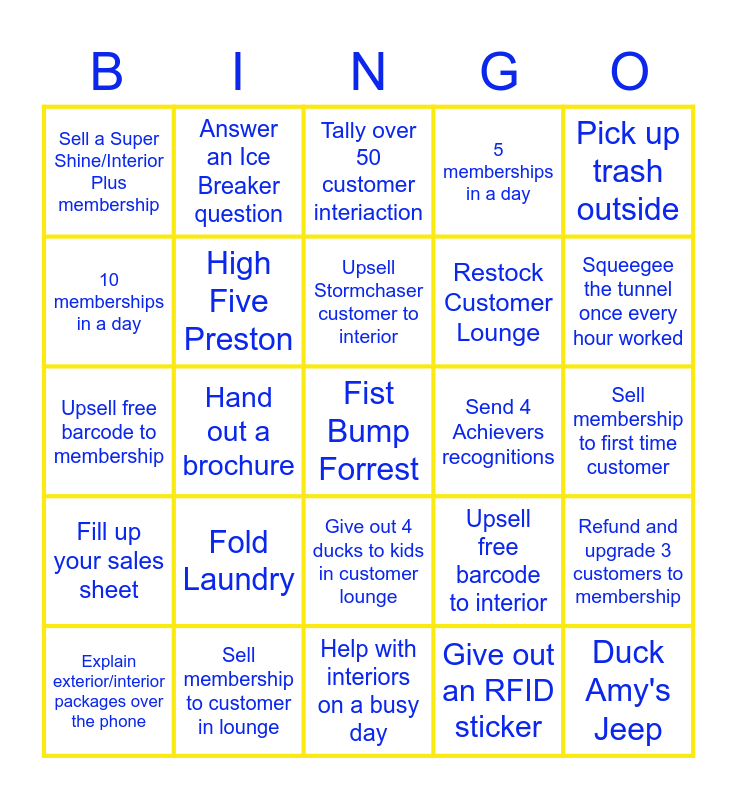 This bingo card has a free space and 24 words: Fold Laundry, Sell membership to customer in lounge, Upsell Stormchaser customer to interior, Explain exterior/interior packages over the phone, Pick up trash outside, Sell a Super Shine/Interior Plus membership, 10 memberships in a day, Answer an Ice Breaker question, Send 4 Achievers recognitions, Give out 4 ducks to kids in customer lounge, Restock Customer Lounge, Upsell free barcode to membership, Upsell free barcode to interior, Refund and upgrade 3 customers to membership, High Five Preston, Give out an RFID sticker, Sell membership to first time customer, Tally over 50 customer interiaction, Squeegee the tunnel once every hour worked, Hand out a brochure, Duck Amy's Jeep, Fill up your sales sheet, 5 memberships in a day and Help with interiors on a busy day.