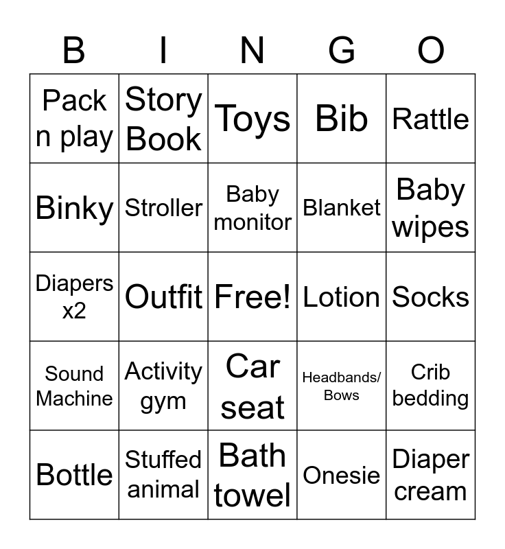 This bingo card has a free space and 28 words: Crib bedding, Swaddles, Blanket, Onesie, Binky, Toys, Story Book, Sound Machine, Lotion, Bottle, Diapers x2, Bib, Stuffed animal, Bath towel, Baby wipes, Bouncer, Activity gym, Stroller, Baby monitor, Car seat, Pack n play, Burp cloths, Diaper cream, Outfit, Socks, Headbands/ Bows, Rattle and Crib.