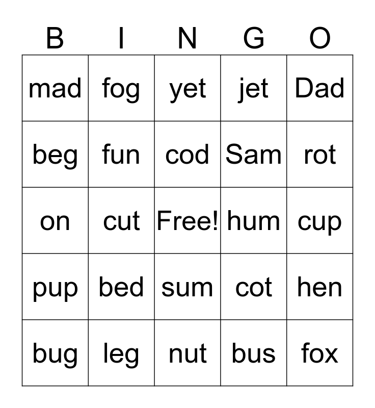 This bingo card has a free space and 24 words: bed, leg, cod, bug, Dad, mad, beg, fog, hum, sum, Sam, on, cot, hen, fun, bus, cup, yet, rot, cut, fox, pup, jet and nut.