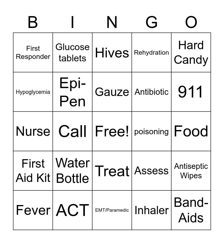 This bingo card has a free space and 24 words: Water Bottle, ACT, Gauze, Fever, Hard Candy, First Responder, Hypoglycemia, Glucose tablets, poisoning, Treat, Antibiotic, Nurse, Assess, Antiseptic Wipes, Epi-Pen, Inhaler, Food, Hives, 911, Call, Band-Aids, First Aid Kit, Rehydration and EMT/Paramedic.