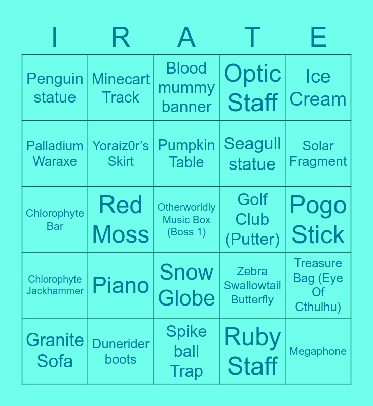 This bingo card has a free space and 24 words: Piano, Dunerider boots, Pumpkin Table, Granite Sofa, Ice Cream, Penguin statue, Palladium Waraxe, Minecart Track, Golf Club (Putter), Snow Globe, Seagull statue, Chlorophyte Bar, Zebra Swallowtail Butterfly, Treasure Bag (Eye Of Cthulhu), Yoraiz0r’s Skirt, Ruby Staff, Pogo Stick, Blood mummy banner, Solar Fragment, Red Moss, Megaphone, Chlorophyte Jackhammer, Optic Staff and Spike ball Trap.