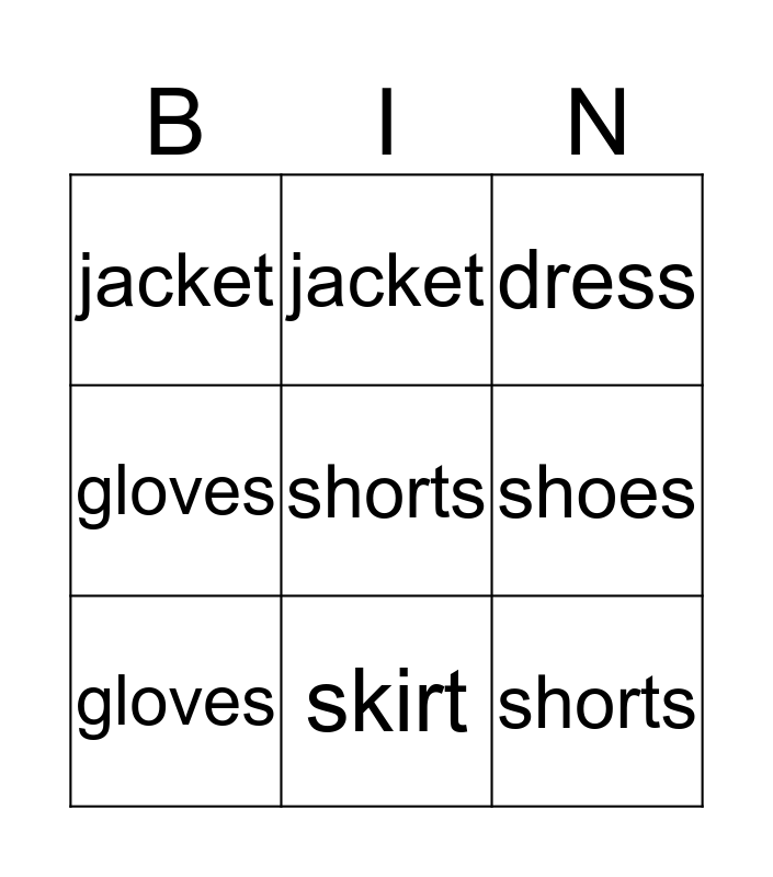 This bingo card has 9 words: gloves, dress, jacket, gloves, jacket, shoes, shorts, shorts and skirt.