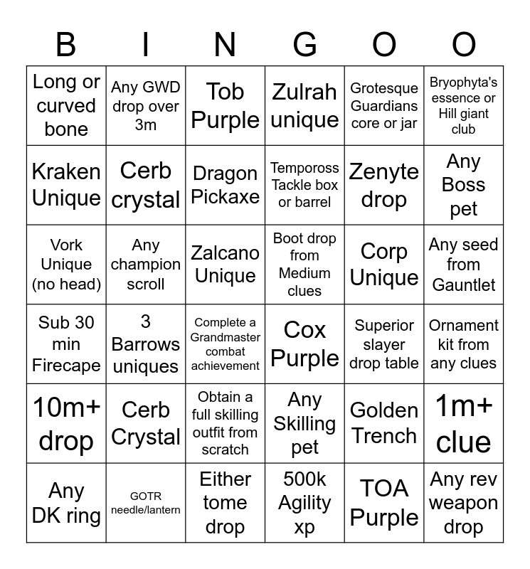 This bingo card has 36 words: Any Skilling pet, Obtain a full skilling outfit from scratch, 500k Agility xp, Kraken Unique, Sub 30 min Firecape, Boot drop from Medium clues, Cerb crystal, Either tome drop, Grotesque Guardians core or jar, Golden Trench, Any Boss pet, Zulrah unique, 1m+ clue, Any champion scroll, Tempoross Tackle box or barrel, Long or curved bone, 10m+ drop, Corp Unique, Vork Unique (no head), Tob Purple, Zalcano Unique, 3 Barrows uniques, Cox Purple, Complete a Grandmaster combat achievement, Superior slayer drop table, Any GWD drop over 3m, Zenyte drop, GOTR needle/lantern, Dragon Pickaxe, Bryophyta's essence or Hill giant club, Any rev weapon drop, Any DK ring, Ornament kit from any clues, Any seed from Gauntlet, Cerb Crystal and TOA Purple.