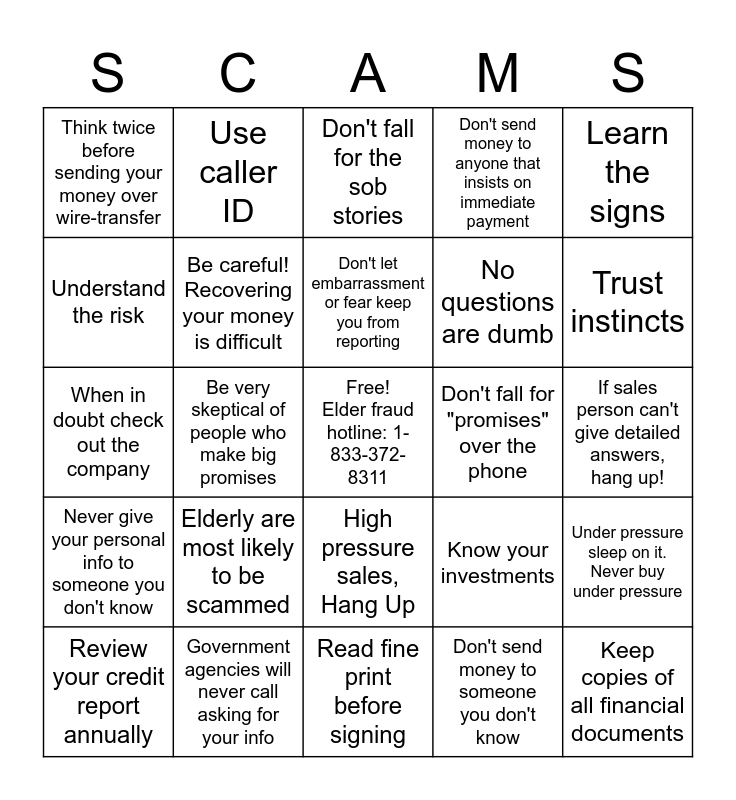 This bingo card has a free space and 24 words: Elderly are most likely to be scammed, Government agencies will never call asking for your info, Don't let embarrassment or fear keep you from reporting, Review your credit report annually, Learn the signs, Think twice before sending your money over wire-transfer, Understand the risk, Use caller ID, Don't fall for "promises" over the phone, High pressure sales, Hang Up, No questions are dumb, When in doubt check out the company, Know your investments, Under pressure sleep on it. Never buy under pressure, Be careful! Recovering your money is difficult, Don't send money to someone you don't know, If sales person can't give detailed answers, hang up!, Don't fall for the sob stories, Trust instincts, Be very skeptical of people who make big promises, Keep copies of all financial documents, Never give your personal info to someone you don't know, Don't send money to anyone that insists on immediate payment and Read fine print before signing.