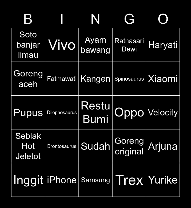 This bingo card has a free space and 24 words: Inggit, Brontosaurus, Kangen, Trex, Haryati, Soto banjar limau, Vivo, Ayam bawang, Oppo, Velocity, Pupus, Fatmawati, Goreng original, Arjuna, Goreng aceh, iPhone, Samsung, Ratnasari Dewi, Xiaomi, Seblak Hot Jeletot, Dilophosaurus, Sudah, Spinosaurus and Yurike.