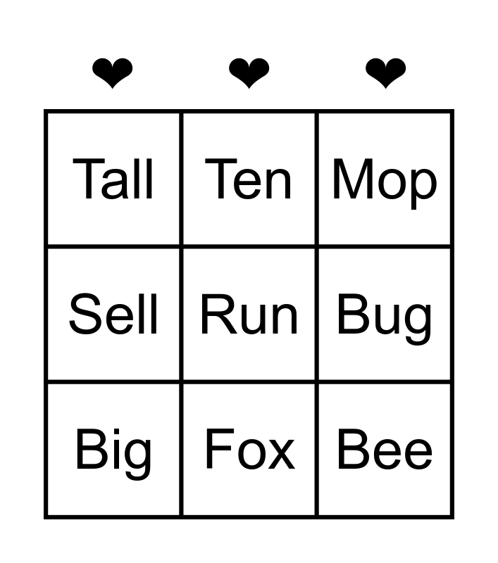 This bingo card has a free space and 8 words: Bug, Mop, Ten, Big, Tall, Bee, Sell and Fox.