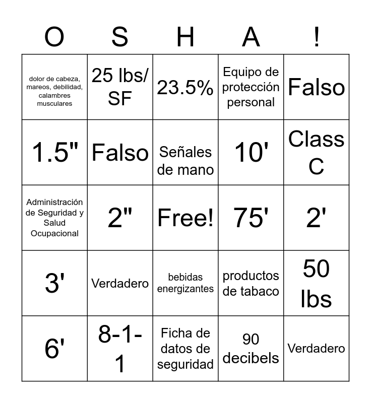 This bingo card has a free space and 28 words: 50 lbs, 3', 10', 90 decibels, 1.5", 23.5%, 25 lbs/ SF, 3', 75', 6', Administración de Seguridad y Salud Ocupacional, Equipo de protección personal, 8-1-1, Ficha de datos de seguridad, Class C, 90%, Verdadero, Falso, Señales de mano, bebidas energizantes, dolor de cabeza, mareos, debilidad, calambres musculares, Bloqueo y etiquetado, Verdadero, 2", 2', productos de tabaco, Falso and caídas.