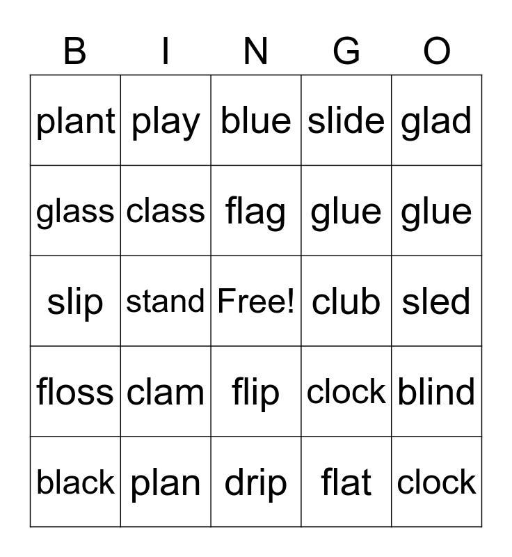 This bingo card has a free space and 24 words: clam, plan, flag, black, glad, plant, glass, play, club, flip, glue, slip, clock, blind, class, flat, sled, blue, glue, stand, clock, floss, slide and drip.