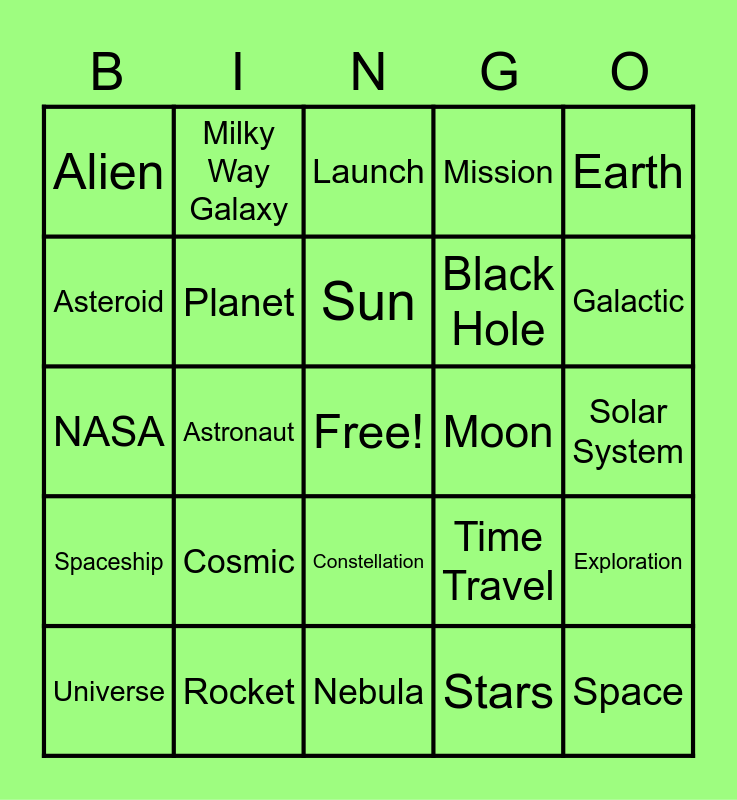 This bingo card has a free space and 24 words: Cosmic, Rocket, Sun, Universe, Earth, Alien, Asteroid, Milky Way Galaxy, Moon, Constellation, Black Hole, NASA, Time Travel, Exploration, Planet, Stars, Solar System, Launch, Galactic, Astronaut, Space, Spaceship, Mission and Nebula.