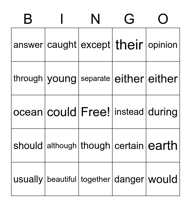 This bingo card has a free space and 24 words: although, beautiful, separate, usually, opinion, answer, through, caught, instead, though, either, ocean, certain, earth, young, danger, during, except, either, could, would, should, their and together.
