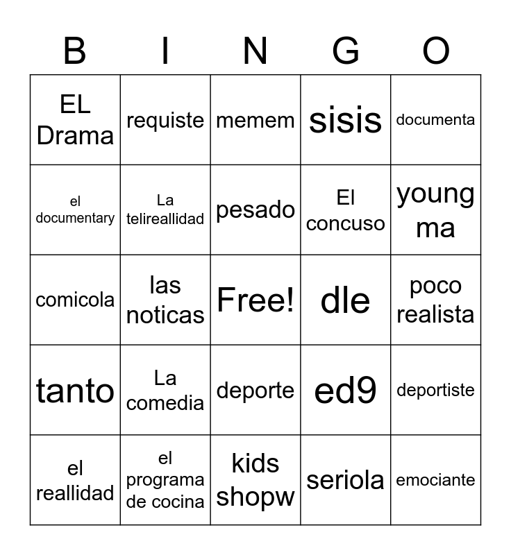This bingo card has a free space and 24 words: La comedia, el programa de cocina, pesado, el reallidad, documenta, EL Drama, el documentary, requiste, dle, deporte, El concuso, comicola, ed9, deportiste, La telireallidad, seriola, poco realista, memem, young ma, las noticas, emociante, tanto, sisis and kids shopw.