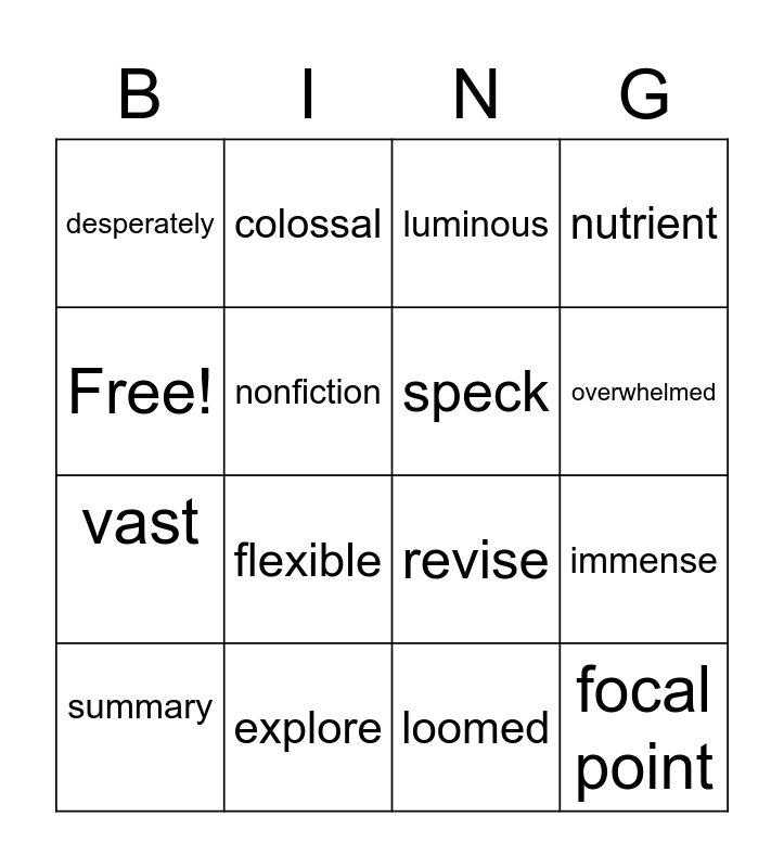 This bingo card has 16 words: explore, immense, luminous, desperately, vast, colossal, revise, loomed, Free!, nonfiction, summary, nutrient, flexible, overwhelmed, speck and focal point.