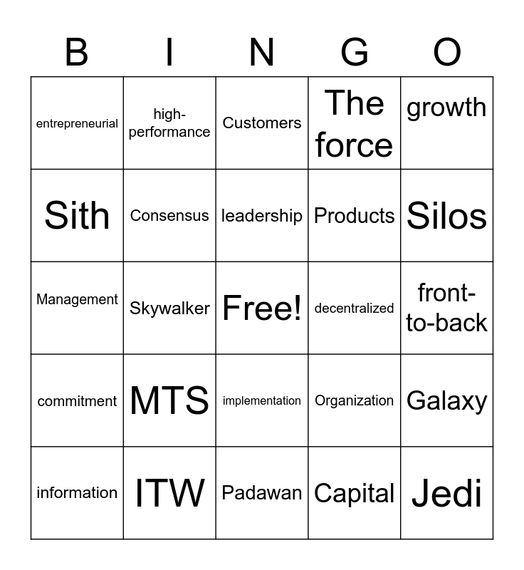 This bingo card has a free space and 34 words: 80/20 process, Capital, long-term success, Investment, commitment, Consensus, growth, information, high-performance, leap of faith, leadership, Customers, customer-backed innovation, Acquisition, decentralized, Silos, ITW, Management, MTS, Organization, implementation, Talent, entrepreneurial, front-to-back, Padawan, Jedi, The force, Inventory, Products, Sith, Yoda, Skywalker, Galaxy and Analysis.