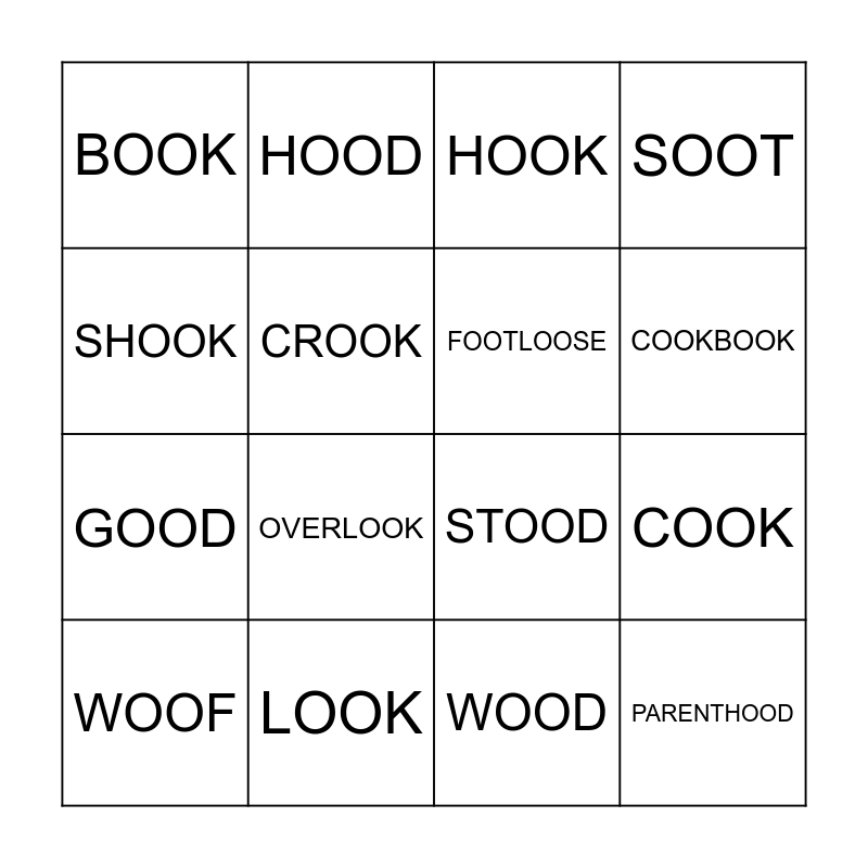 This bingo card has 16 words: LOOK, COOK, HOOK, BOOK, GOOD, HOOD, STOOD, WOOD, SHOOK, CROOK, WOOF, SOOT, OVERLOOK, COOKBOOK, FOOTLOOSE and PARENTHOOD.