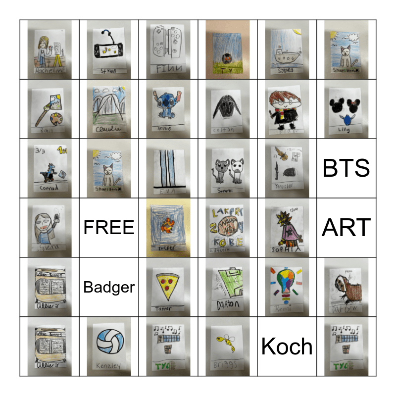 This bingo card has 31 images and 5 words: FREE, ART, BTS, Badger and Koch.