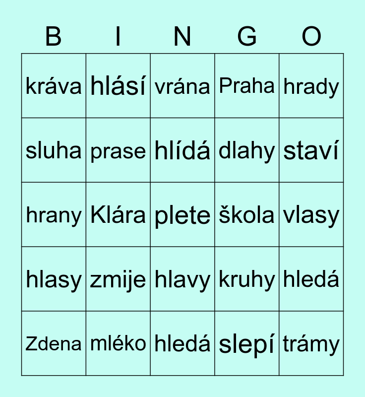 This bingo card has a free space and 29 words: Zdena, Stela, Klára, Zlata, kráva, vrána, prase, zmije, škola, mléko, vlasy, trámy, hledá, slepí, staví, práce, hlavy, hlasy, hrady, hrany, kruhy, dráhy, dlahy, sluha, Praha, hlásí, hledá, hlídá and hraje.