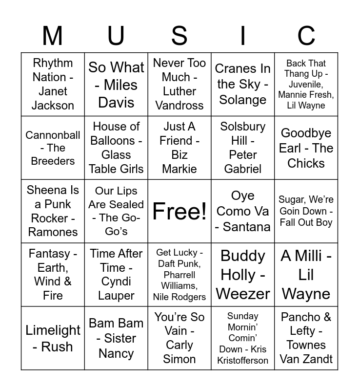 This bingo card has a free space and 50 words: Baby Love - The Supremes, Pancho & Lefty - Townes Van Zandt, Without You - Harry Nilsson, You’re So Vain - Carly Simon, Time After Time - Cyndi Lauper, Where Is My Mind? - Pixies, So What - Miles Davis, Welcome To the Jungle - Guns N’ Roses, Cannonball - The Breeders, Old Town Road - Lil Nas X, House of Balloons - Glass Table Girls, Cranes In the Sky - Solange, A Milli - Lil Wayne, Buddy Holly - Weezer, I Can’t Help Myself - Four Tops, Bad Romance - Lady Gaga, Just A Friend - Biz Markie, Oye Como Va - Santana, Cross Road Blues - Robert Johnson, Back That Thang Up - Juvenile, Mannie Fresh, Lil Wayne, Our Lips Are Sealed - The Go-Go’s, Sunday Mornin’ Comin’ Down - Kris Kristofferson, Rhythm Nation - Janet Jackson, Solsbury Hill - Peter Gabriel, House of the Rising Sun - The Animals, Midnight Train to Georgia - Gladys Night & The Pips, Goodbye Earl - The Chicks, Come As You Are - Nirvana, Never Too Much - Luther Vandross, Get Lucky - Daft Punk, Pharrell Williams, Nile Rodgers, Loser - Beck, Livin’ On A Prayer - Bon Jovi, Summertime Sadness - Lana Del Ray, White Rabbit - Jefferson Airplane, Bam Bam - Sister Nancy, (Don’t Fear) The Reaper - Blue Oyster Cult, Help! - The Beatles, Cosmic Dancer - T. Rex, In Da Club - 50 Cent, Sugar, We’re Goin Down - Fall Out Boy, Ace of Spades - Motorhead, The House That Built Me - Miranda Lambert, Savage - Megan Thee Stallion, Call Me Maybe - Carly Rae Jepsen, Limelight - Rush, Sheena Is a Punk Rocker - Ramones, West End Girls - Pet Shop Boys, Rapper’s Delight - The Sugarhill Gang, Fantasy - Earth, Wind & Fire and Alive - Pearl Jam.
