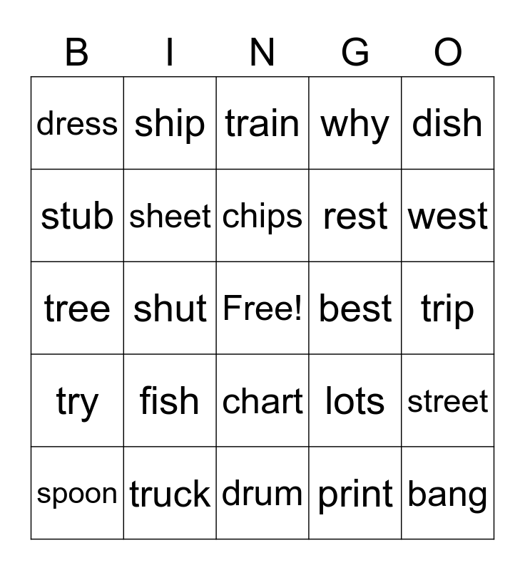 This bingo card has a free space and 24 words: fish, truck, chips, spoon, dish, dress, stub, ship, best, chart, rest, tree, lots, street, sheet, print, trip, train, west, shut, bang, try, why and drum.