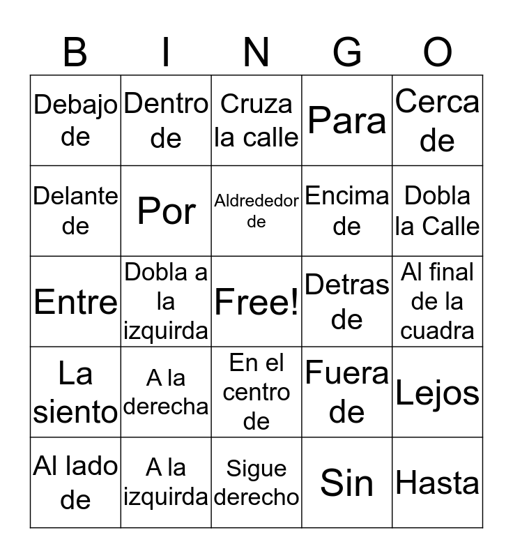 This bingo card has a free space and 24 words: A la derecha, A la izquirda, Aldrededor de, Al lado de, Cerca de, Debajo de, Delante de, Dentro de, Detras de, En el centro de, Encima de, Entre, Fuera de, Lejos, Por, Sin, Al final de la cuadra, Cruza la calle, Dobla la Calle, Dobla a la izquirda, Hasta, La siento, Para and Sigue derecho.