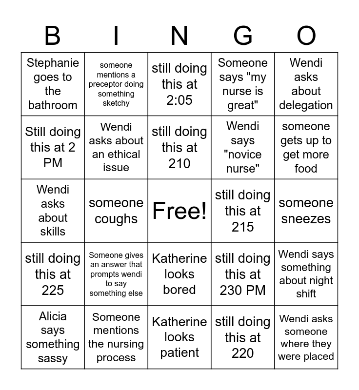 This bingo card has a free space and 24 words: Someone gives an answer that prompts wendi to say something else, Someone mentions the nursing process, still doing this at 210, Alicia says something sassy, Wendi asks about delegation, Stephanie goes to the bathroom, Still doing this at 2 PM, someone mentions a preceptor doing something sketchy, still doing this at 215, Katherine looks bored, Wendi says "novice nurse", Wendi asks about skills, still doing this at 230 PM, Wendi says something about night shift, Wendi asks about an ethical issue, still doing this at 220, someone sneezes, still doing this at 2:05, someone gets up to get more food, someone coughs, Wendi asks someone where they were placed, still doing this at 225, Someone says "my nurse is great" and Katherine looks patient.
