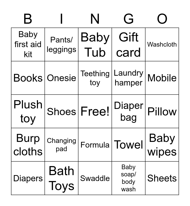 This bingo card has a free space and 39 words: Bottle, Pacifier, Blanket, Onesie, Diapers, Formula, Teething toy, Socks, Washcloth, Burp cloths, Shoes, Gift card, Sheets, Pillow, Diaper bag, Changing pad, Baby carrier, Baby first aid kit, Crib sheets, Towel, Books, Swaddle, Laundry hamper, Mobile, Diaper cream, Night light, Bibs, Baby monitor, Shirts, Pants/ leggings, Cash, Bassinet, Baby Tub, Bath Toys, Baby soap/ body wash, Play pen, Baby wipes, Plush toy and Baby hat or cap.