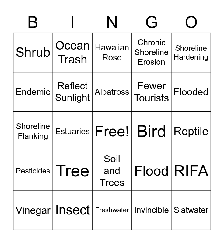 This bingo card has a free space and 29 words: Vinegar, Rocky Beach, Estuaries, Fleshy Leaves, Shrub, Hawaiian Rose, Reflect Sunlight, Tree, Bird, Insect, Reptile, Slatwater, Freshwater, Invincible, Flooded, Invertebrates, Soil and Trees, Pesticides, Shoreline Hardening, Shoreline Flanking, Flood, Climate Change, Fewer Tourists, Endemic, Chronic Shoreline Erosion, Ocean Trash, RIFA, Albatross and Hawksbill turtle.