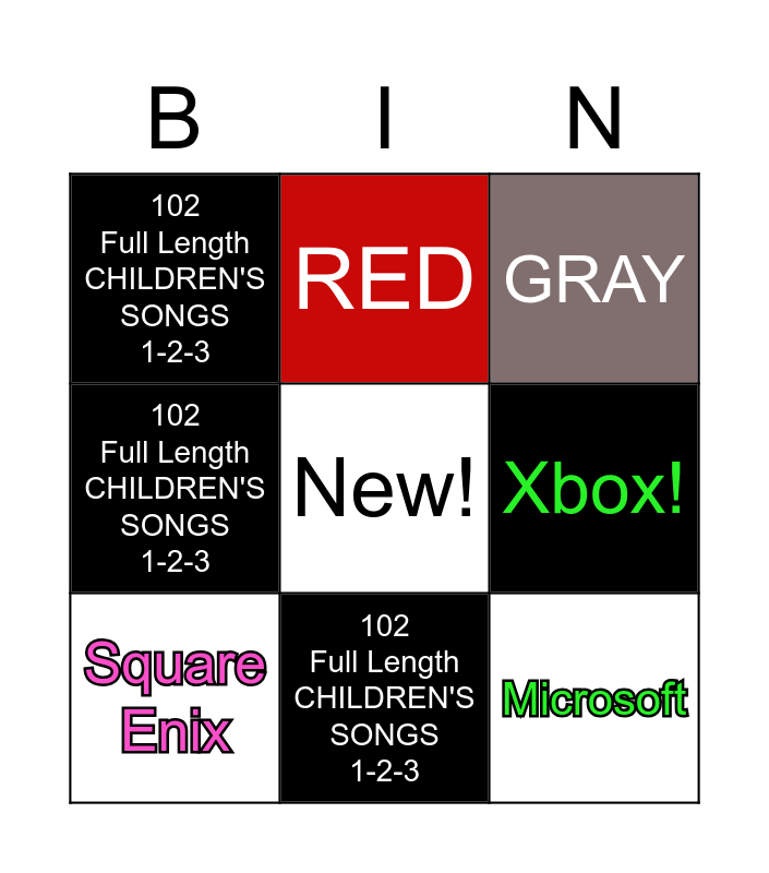 This bingo card has a free space and 32 words: Nintendo, Konami, SEGA, Capcom, Bandai Namco, Square Enix, Microsoft, SNK, RED, Nintendo, 102 Full Length CHILDREN'S SONGS 1-2-3, GRAY, Konami, 102 Full Length CHILDREN'S SONGS 1-2-3, BLUE, SEGA, 102 Full Length CHILDREN'S SONGS 1-2-3, YELLOW, Capcom, 102 Full Length CHILDREN'S SONGS 1-2-3, ORANGE, Bandai Namco, 102 Full Length CHILDREN'S SONGS 1-2-3, PINK, Square Enix!, 102 Full Length CHILDREN'S SONGS 1-2-3, GREEN, Xbox!, 102 Full Length CHILDREN'S SONGS 1-2-3, TURQUOISE, SNK! and 102 Full Length CHILDREN'S SONGS 1-2-3.